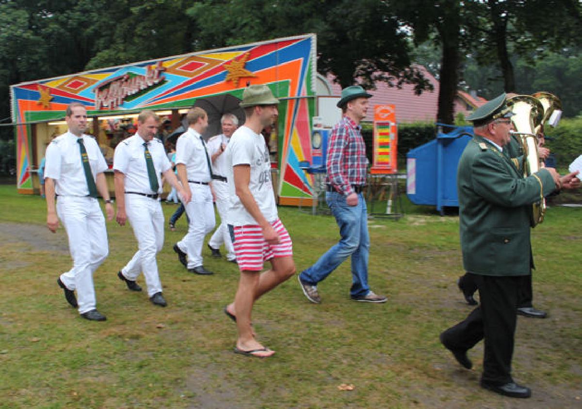Wenn es darum ginge, in Gronau Experte für den Klimawandel und Wetterextreme zu finden, wäre es sicher eine gute Idee, mit der Suche bei den Buterländern anzufangen. Ja, das Wetter, nickt Heinz Verst, Präsident des Schützenvereins Buterland-Beckerhook. “Entweder wir haben mit Hitze zu kämpfen - oder solche Regenschlachten.” Auch als sich gegen 15.45 Uhr die fünf Aspiranten gefunden haben, die ernsthaft um die Königswürde ringen wollten, zeichnete sich wieder eine Wasserschlacht ab. “Zieht besser eure Jacken an”, empfiehlt denn auch Stefan Konetzka von der Gronauer Stadtkapelle den Musikern, ehe sie die Offiziere und die Aspiranten zur Vogelstange begleiten. Einer von ihnen nimmt es mit Humor: Er marschiert mit kurzer Ringelhose und Flipflops durch den Matsch.